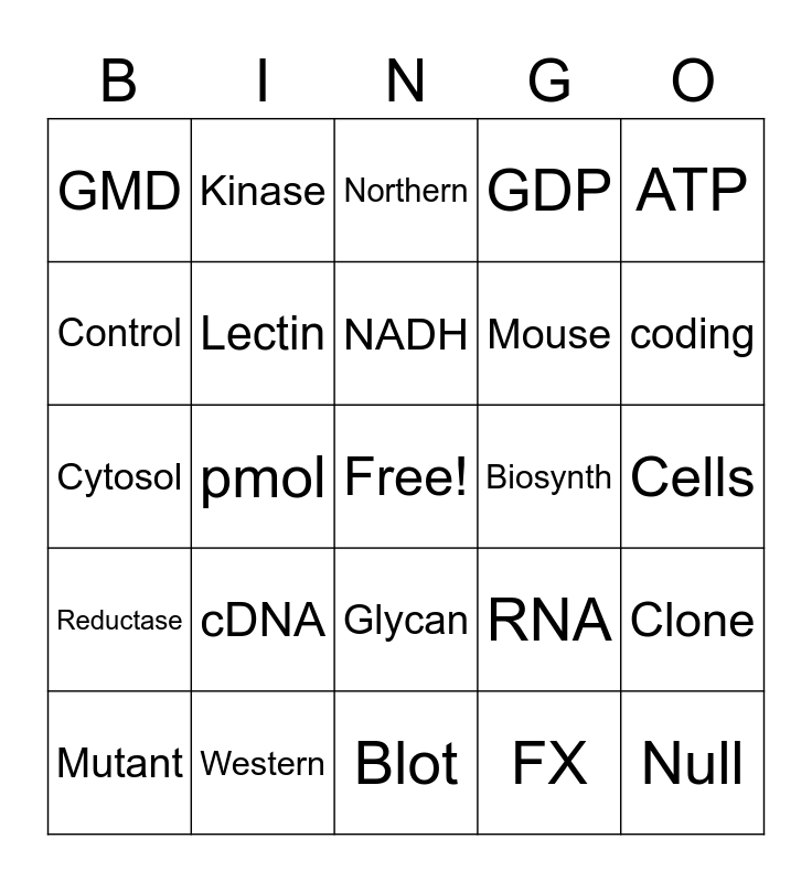 This bingo card has a free space and 35 words: Fucose, Mannose, Glucose, Lectin, Glycan, GDP, Control, NADPH, NADH, Keto, Cytosol, ATP, CHO, HPLC, GMD, Biosynth, FX, pmol, Reductase, Null, RNA, Mutant, Clone, Western, Northern, coding, transfection, DNA, Mouse, Cells, anti-GMD, Blot, cDNA, Kinase and Phosphorylase.