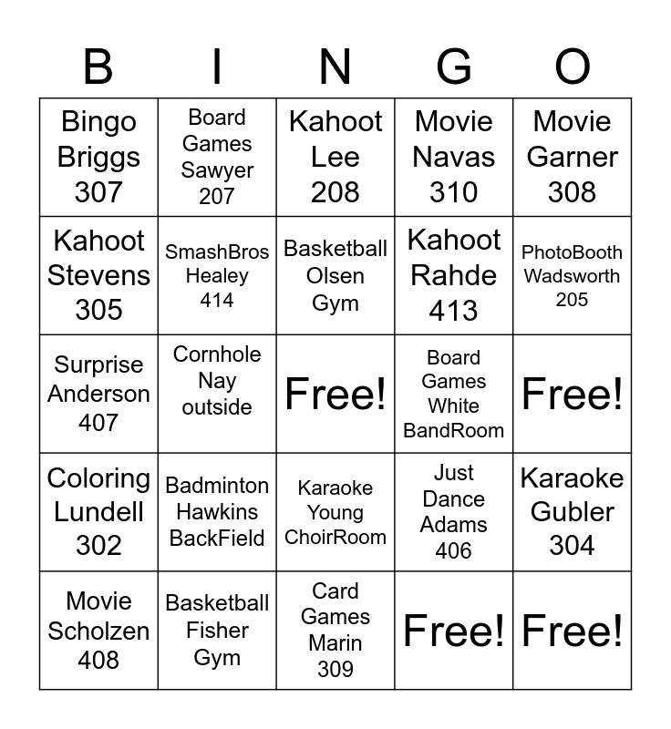 This bingo card has a free space and 30 words: Basketball Fisher Gym, Mariokart Healey 410, Cornhole Nay outside, CupcakeWalk Bringhurst Commons, Bingo Briggs 307, Kahoot Lee 208, SmashBros Healey 414, Karaoke Young ChoirRoom, Board Games White BandRoom, Card Games Marin 309, Free!, Free!, Free!, Free!, PhotoBooth Wadsworth 205, Breakout EDU Sorenson 204, Just Dance Adams 406, Coloring Lundell 302, Badminton Hawkins BackField, Movie Garner 308, Surprise Anderson 407, Puzzles Barrett Library, Board Games Sawyer 207, Kahoot Rahde 413, Kahoot Stevens 305, Movie Navas 310, Karaoke Gubler 304, Movie Scholzen 408, Basketball Olsen Gym and JustDance Harvey 209.