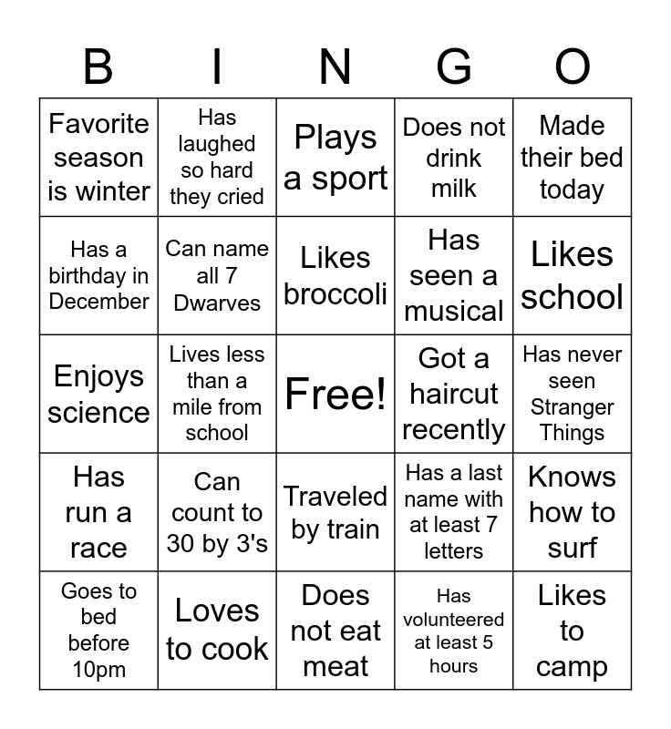 This bingo card has a free space and 24 words: Can count to 30 by 3's, Loves to cook, Likes broccoli, Goes to bed before 10pm, Made their bed today, Favorite season is winter, Has a birthday in December, Has laughed so hard they cried, Got a haircut recently, Traveled by train, Has seen a musical, Enjoys science, Has a last name with at least 7 letters, Knows how to surf, Can name all 7 Dwarves, Has volunteered at least 5 hours, Has never seen Stranger Things, Plays a sport, Likes school, Lives less than a mile from school, Likes to camp, Has run a race, Does not drink milk and Does not eat meat.