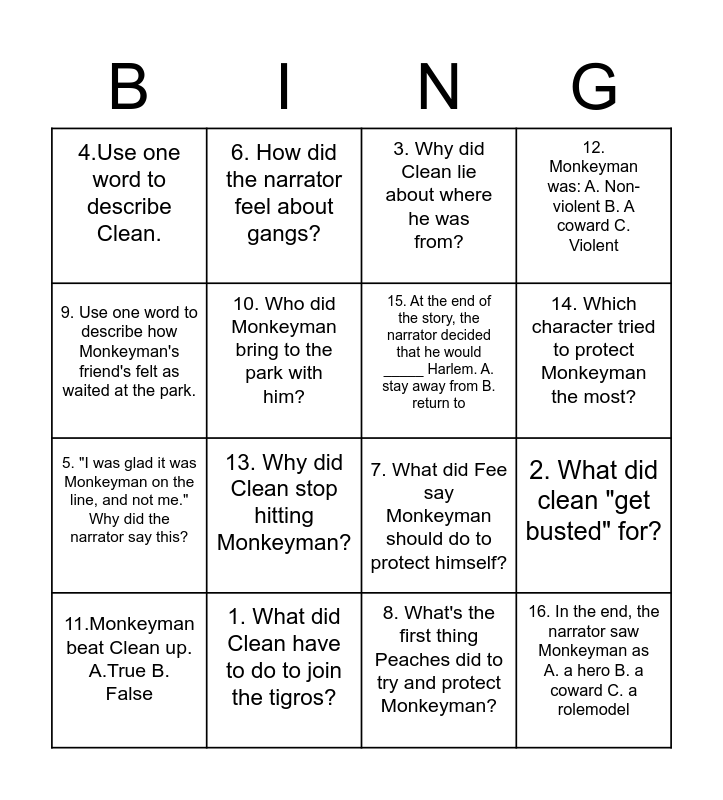 This bingo card has 16 words: 1. What did Clean have to do to join the tigros?, 2. What did clean "get busted" for?, 3. Why did Clean lie about where he was from?, 4.Use one word to describe Clean., 5. "I was glad it was Monkeyman on the line, and not me." Why did the narrator say this?, 6. How did the narrator feel about gangs?, 7. What did Fee say Monkeyman should do to protect himself?, 8. What's the first thing Peaches did to try and protect Monkeyman?, 9. Use one word to describe how Monkeyman's friend's felt as waited at the park., 10. Who did Monkeyman bring to the park with him?, 11.Monkeyman beat Clean up. A.True B. False, 12. Monkeyman was: A. Non-violent B. A coward C. Violent, 13. Why did Clean stop hitting Monkeyman?, 14. Which character tried to protect Monkeyman the most?, 15. At the end of the story, the narrator decided that he would _____ Harlem. A. stay away from B. return to and 16. In the end, the narrator saw Monkeyman as A. a hero B. a coward C. a rolemodel.