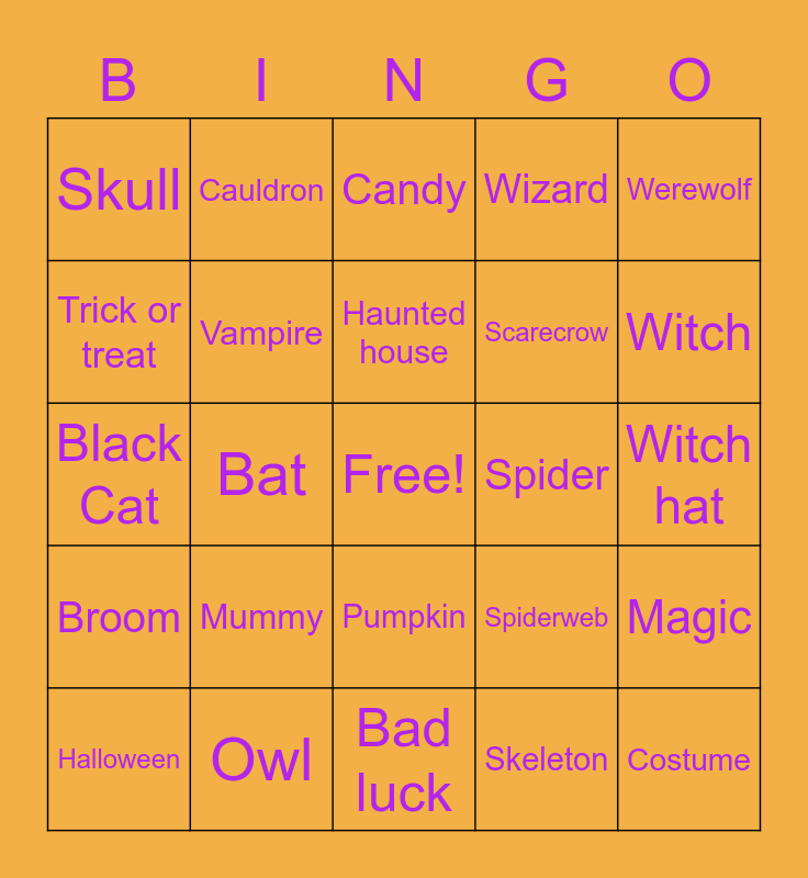 This bingo card has a free space and 28 words: Halloween, Jack o' lantern, Haunted house, Skeleton, Werewolf, Trick or treat, Cauldron, Pumpkin, Spider, Costume, Black Cat, Vampire, Zombie, Spiderweb, Witch, Ghost, Mummy, Candy, Wizard, Magic, Skull, Owl, Bad luck, Scarecrow, Witch hat, Broom, Bat and Frankenstein.