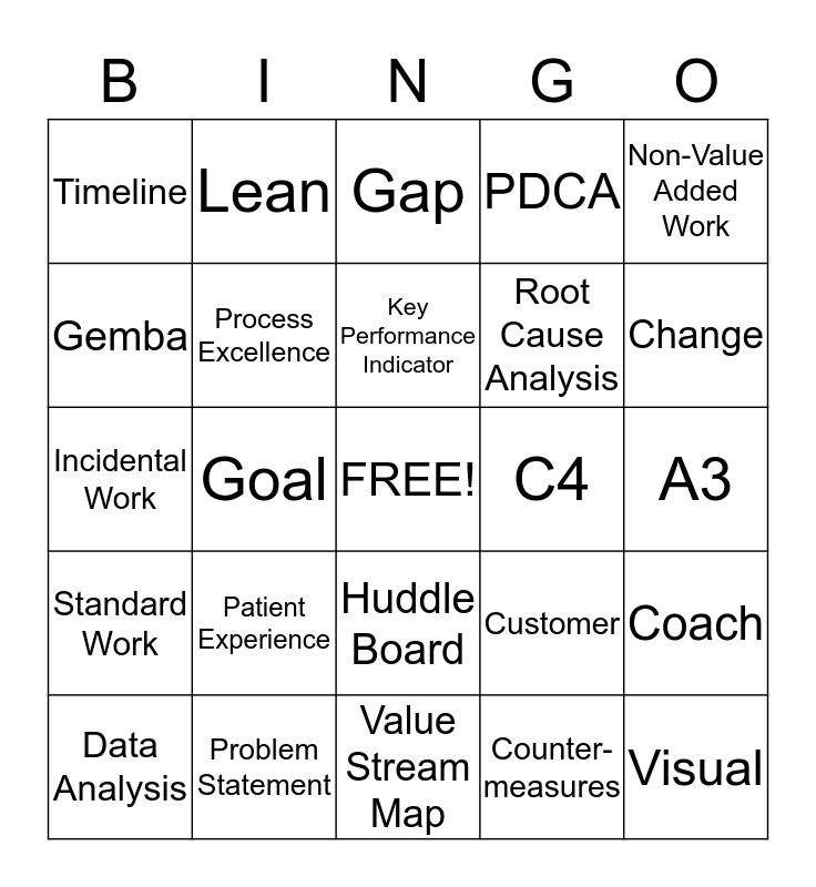 This bingo card has a free space and 30 words: Problem Statement, Value-Added Work, Goal, Job Breakdown, Timeline, Gap, Process Excellence, Huddle Board, C4, Value Stream Map, A3, Visual, Counter-measures, Current Condition, Change, Value, Customer, Standard Work, Patient Experience, Non-Value Added Work, Incidental Work, Waste, Lean, Root Cause Analysis, Gemba, PDCA, Coach, Data Analysis, Key Performance Indicator and Leader Standard Work.