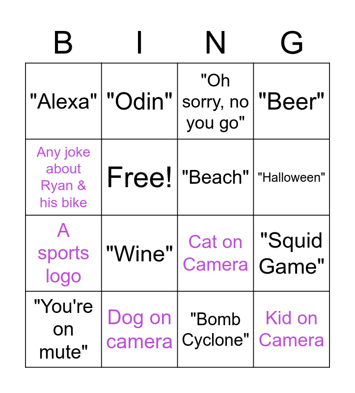 This bingo card has 16 words: "You're on mute", Dog on camera, "Oh sorry, no you go", "Beer", Any joke about Ryan & his bike, "Odin", Cat on Camera, "Squid Game", "Alexa", Free!, "Bomb Cyclone", "Halloween", A sports logo, "Wine", "Beach" and Kid on Camera.