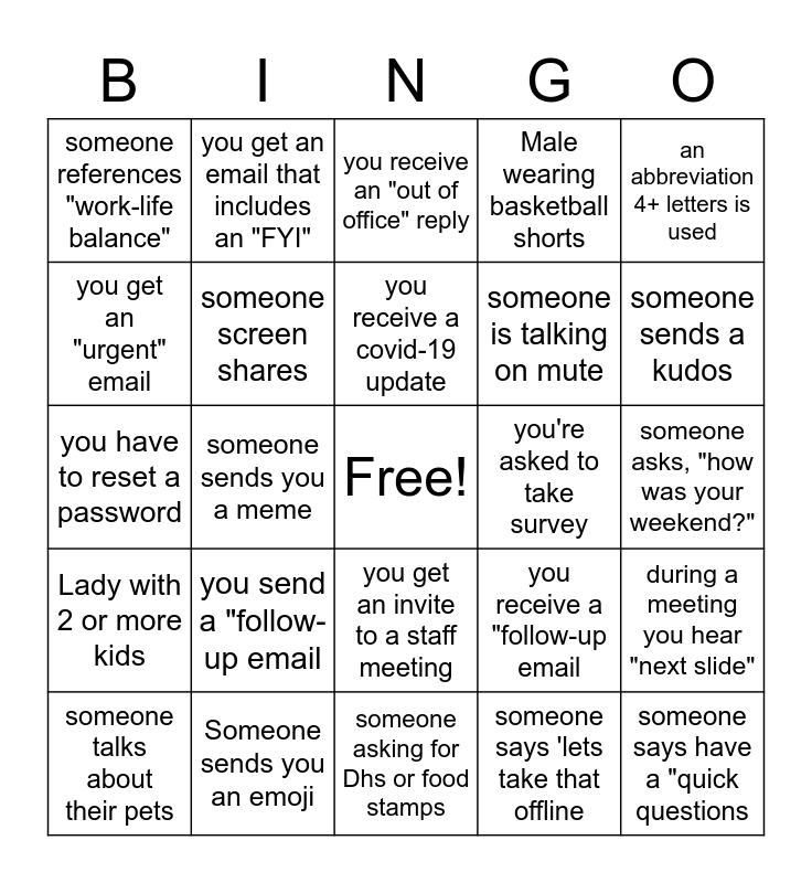 This bingo card has a free space and 24 words: you send a "follow-up email, Someone sends you an emoji, you receive a covid-19 update, someone talks about their pets, an abbreviation 4+ letters is used, someone references "work-life balance", you get an "urgent" email, you get an email that includes an "FYI", you're asked to take survey, you get an invite to a staff meeting, someone is talking on mute, you have to reset a password, you receive a "follow-up email, during a meeting you hear "next slide", someone screen shares, someone says 'lets take that offline, someone asks, "how was your weekend?", you receive an "out of office" reply, someone sends a kudos, someone sends you a meme, someone says have a "quick questions, Lady with 2 or more kids, Male wearing basketball shorts and someone asking for Dhs or food stamps.