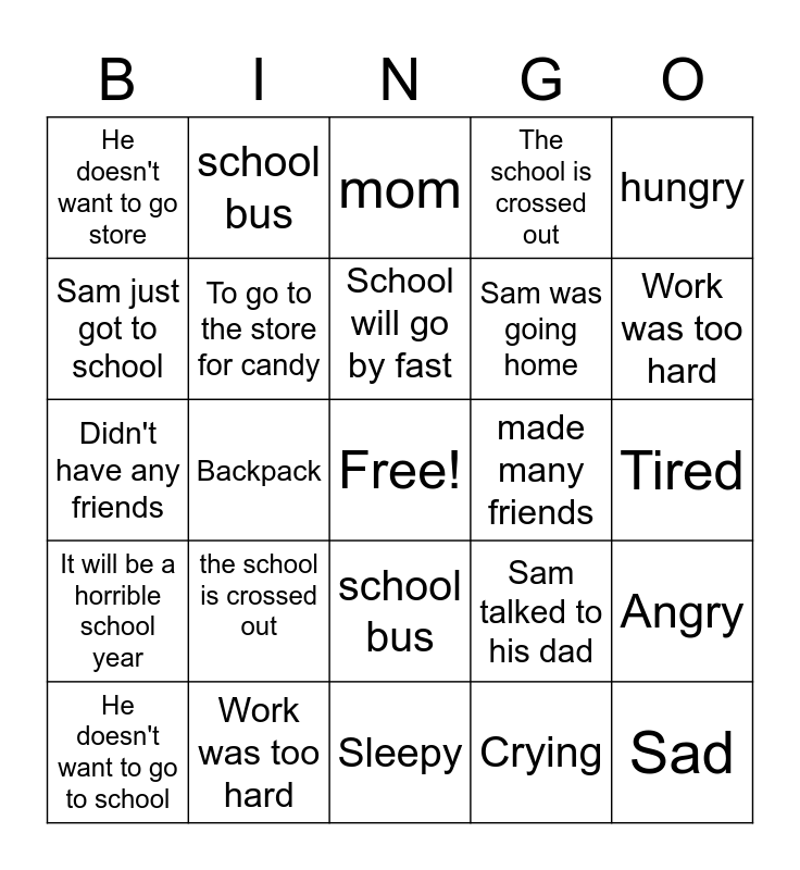 This bingo card has a free space and 24 words: He doesn't want to go to school, the school is crossed out, School will go by fast, Crying, hungry, He doesn't want to go store, school bus, mom, made many friends, Tired, Didn't have any friends, To go to the store for candy, Sam talked to his dad, Angry, Sam just got to school, Work was too hard, Sleepy, The school is crossed out, Work was too hard, It will be a horrible school year, Backpack, school bus, Sam was going home and Sad.