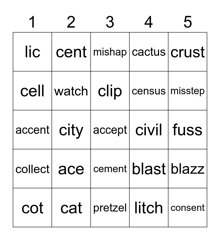 This bingo card has a free space and 24 words: ace, cat, clip, cot, crust, lic, cell, cent, civil, cement, census, accent, blast, blazz, watch, litch, fuss, mishap, misstep, city, consent, collect, cactus and pretzel.