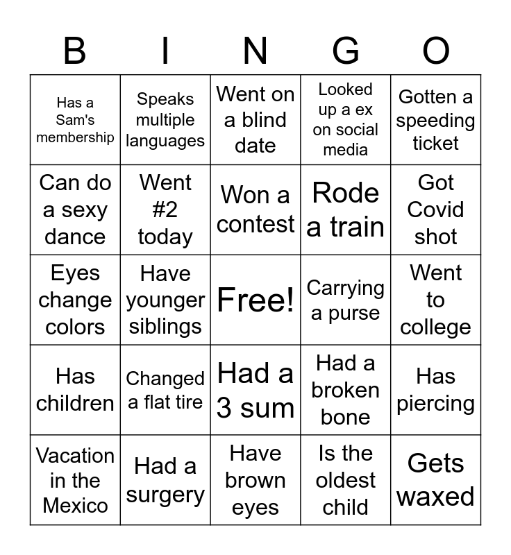 This bingo card has a free space and 25 words: Has children, Had a surgery, Have brown eyes, Is the oldest child, Gotten a speeding ticket, Has a Sam's membership, Speaks multiple languages, Went on a blind date, Carrying a purse, Has piercing, Can do a sexy dance, Went #2 today, Can whistle, Had a broken bone, Got Covid shot, Vacation in the Mexico, Have younger siblings, Won a contest, Rode a train, Went to college, Eyes change colors, Changed a flat tire, Had a 3 sum, Looked up a ex on social media and Gets waxed.
