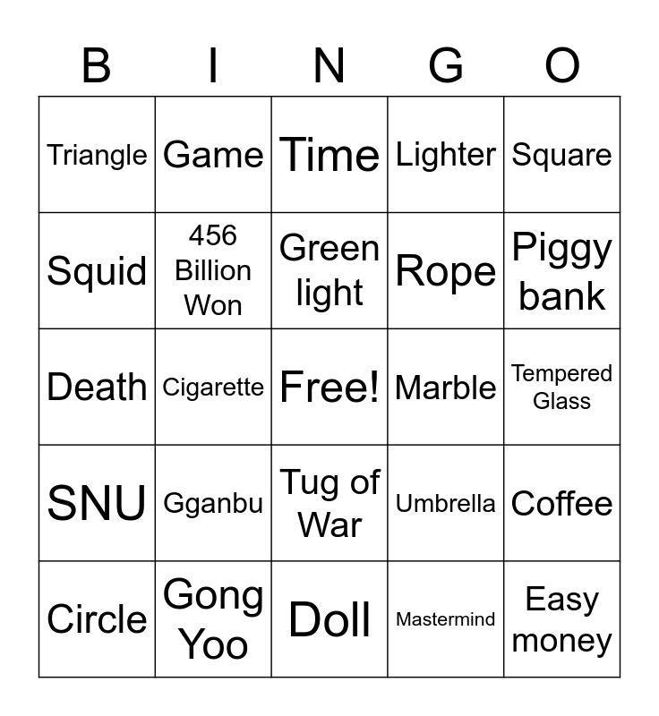 This bingo card has a free space and 25 words: Gganbu, Doll, Green light, Circle, Square, Triangle, Squid, Game, Marble, Tug of War, Rope, Death, Umbrella, Coffee, 456 Billion Won, Winner, Tempered Glass, Time, Piggy bank, Cigarette, Easy money, Gong Yoo, SNU, Lighter and Mastermind.