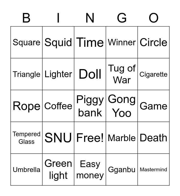 This bingo card has 26 words: Free!, Gganbu, Doll, Green light, Circle, Square, Triangle, Squid, Game, Marble, Tug of War, Rope, Death, Umbrella, Coffee, 456 Billion Won, Winner, Tempered Glass, Time, Piggy bank, Cigarette, Easy money, Gong Yoo, SNU, Lighter and Mastermind.