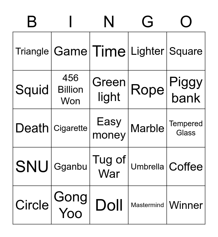 This bingo card has 25 words: Gganbu, Doll, Green light, Circle, Square, Triangle, Squid, Game, Marble, Tug of War, Rope, Death, Umbrella, Coffee, 456 Billion Won, Winner, Tempered Glass, Time, Piggy bank, Cigarette, Easy money, Gong Yoo, SNU, Lighter and Mastermind.