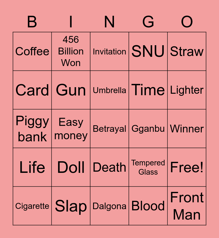 This bingo card has 26 words: Death, Blood, Umbrella, Slap, Straw, Coffee, Card, 456 Billion Won, Winner, Tempered Glass, Time, Piggy bank, Free!, Cigarette, Easy money, Gong Yoo, SNU, Life, Invitation, Betrayal, Lighter, Dalgona, Gganbu, Doll, Gun and Front Man.