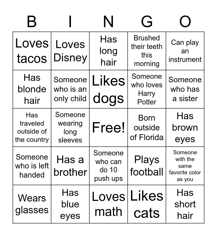 This bingo card has a free space and 24 words: Has a brother, Has blue eyes, Likes dogs, Wears glasses, Can play an instrument, Loves tacos, Has blonde hair, Loves Disney, Born outside of Florida, Someone who can do 10 push ups, Someone who loves Harry Potter, Has traveled outside of the country, Plays football, Someone with the same favorite color as you, Someone who is an only child, Likes cats, Has brown eyes, Has long hair, Someone who has a sister, Someone wearing long sleeves, Has short hair, Someone who is left handed, Brushed their teeth this morning and Loves math.