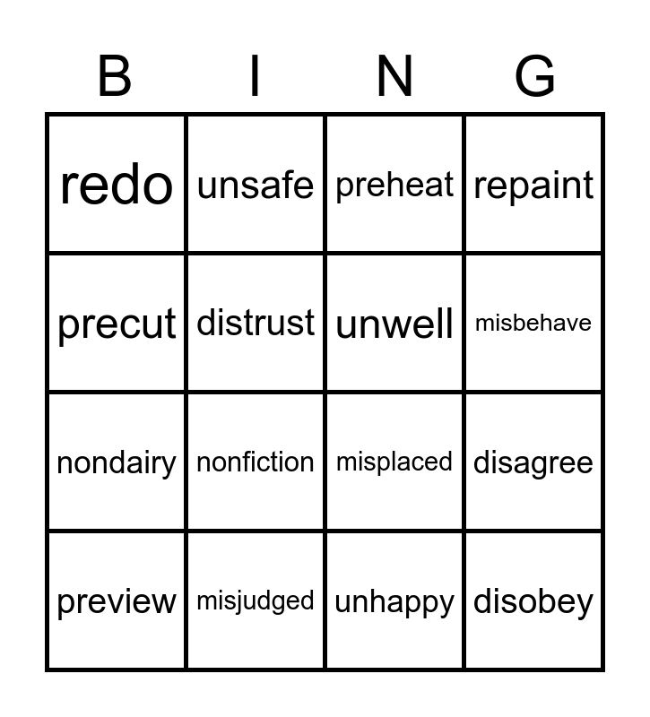 This bingo card has 16 words: misjudged, disagree, preheat, redo, nondairy, unsafe, misplaced, unhappy, precut, distrust, preview, repaint, nonfiction, misbehave, unwell and disobey.