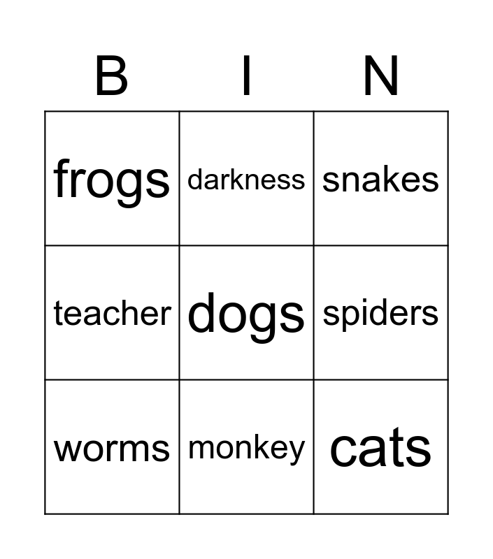 This bingo card has a free space and 8 words: spiders, snakes, darkness, worms, frogs, cats, teacher and monkey.