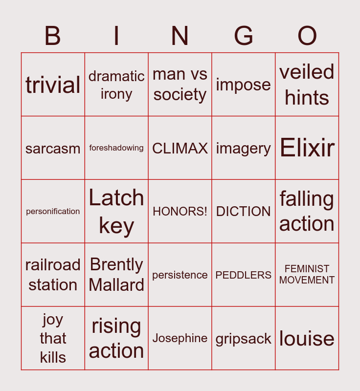 This bingo card has a free space and 49 words: Richards, louise, Mrs. mallard, Josephine, Brently Mallard, situational irony, dramatic irony, verbal irony, sarcasm, oxymoron, foreshadowing, impose, FEMINIST MOVEMENT, PEDDLERS, EXPOSITION, FORESTALL, CLIMAX, DICTION, subtle, veiled hints, Latch key, gripsack, trivial, imagery, a heart trouble, Elixir, joy that kills, conflict, persistence, railroad station, riot, monstrous joy, aquiver, impulse, rising action, vacant, storm of grief, goddess of Victory, falling action, Kate Chopin, late 19th Century, setting, plot structure, metaphor, personification, man vs society, simile, man vs self and sudden wild abandonment.