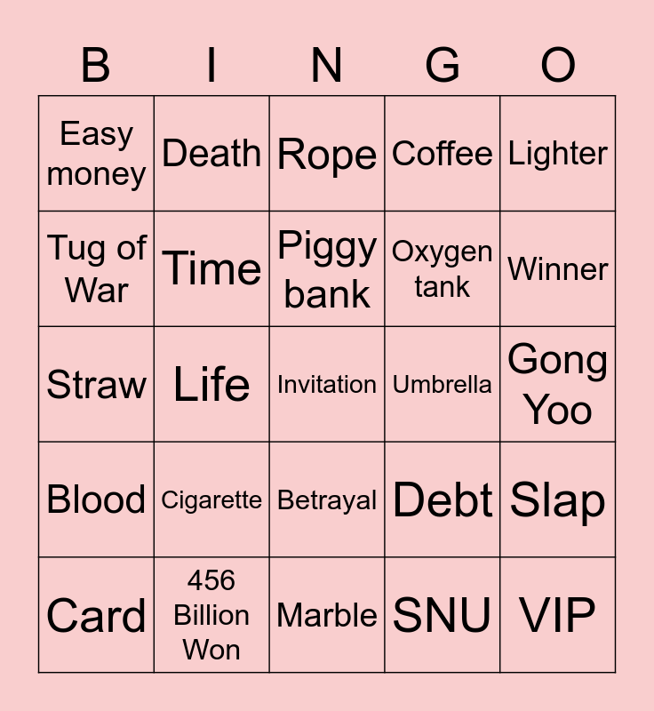 This bingo card has 27 words: Debt, VIP, Oxygen tank, Marble, Tug of War, Rope, Death, Blood, Umbrella, Slap, Straw, Coffee, Card, 456 Billion Won, Winner, Tempered Glass, Time, Piggy bank, Cigarette, Easy money, Gong Yoo, SNU, Life, Invitation, Betrayal, Lighter and Mastermind.