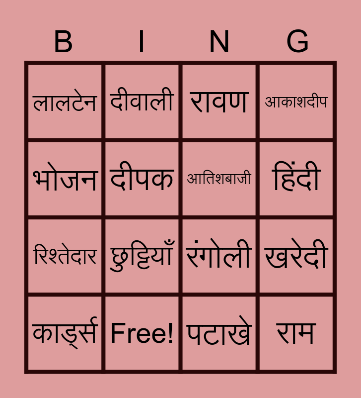 This bingo card has 24 words: मेहंदी, उपहार, हिंदी, नया साल, भोजन, लालटेन, दीपक, दीवाली, Free!, त्यौहार, रिश्तेदार, रंगोली, पूजा की थाली, गहने, आतिशबाजी, मिठाई, पटाखे, रावण, छुट्टियाँ, खरेदी, कार्ड्स, राम, आकाशदीप and ख़ुशी का माहोल.