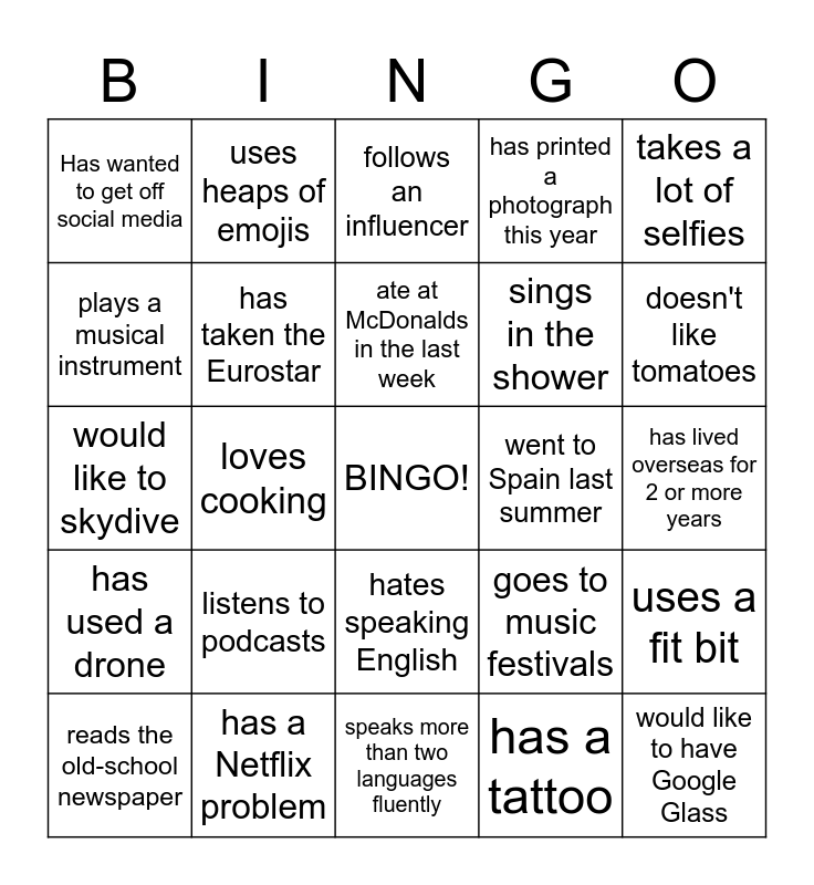 This bingo card has a free space and 24 words: listens to podcasts, has a Netflix problem, ate at McDonalds in the last week, reads the old-school newspaper, takes a lot of selfies, Has wanted to get off social media, plays a musical instrument, uses heaps of emojis, went to Spain last summer, hates speaking English, sings in the shower, would like to skydive, goes to music festivals, uses a fit bit, has taken the Eurostar, has a tattoo, has lived overseas for 2 or more years, follows an influencer, doesn't like tomatoes, loves cooking, would like to have Google Glass, has used a drone, has printed a photograph this year and speaks more than two languages fluently.