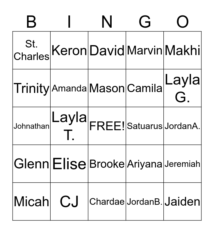 This bingo card has a free space and 24 words: Elise, CJ, Mason, Micah, Makhi, St. Charles, Trinity, Keron, Satuarus, Brooke, Camila, Johnathan, Ariyana, Jeremiah, Amanda, JordanB., JordanA., David, Layla G., Layla T., Jaiden, Glenn, Marvin and Chardae.