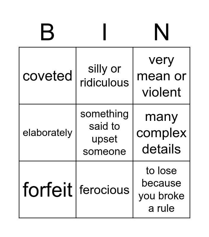 This bingo card has 14 words: absurd, taunt, forfeit, silly or ridiculous, elaborately, something said to upset someone, to lose because you broke a rule, despised, ferocious, coveted, wanted very much, many complex details, very mean or violent and have a strong dislike.