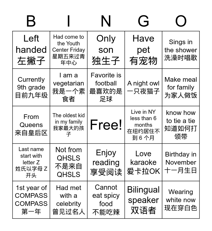This bingo card has a free space and 24 words: Not from QHSLS 不是来自 QHSLS, Had met with a celebrity 曾见过名人, Favorite is football 最喜欢的是足球, 1st year of COMPASS COMPASS 第一年, Sings in the shower 洗澡时唱歌, Left handed 左撇子, Currently 9th grade 目前九年级, Had come to the Youth Center Friday 星期五来过青年中心, Live in NY less than 6 months 在纽约居住不到 6 个月, Enjoy reading 享受阅读, A night owl 一只夜猫子, From Queens 来自皇后区, Love karaoke 爱卡拉OK, Birthday in November 十一月生日, I am a vegetarian 我是一个素食者, Bilingual speaker 双语者, know how to tie a tie 知道如何打领带, Only son 独生子, Make meal for family 为家人做饭, The oldest kid in my family 我家最大的孩子, Wearing white now 现在穿白色, Last name start with letter Z 姓氏以字母 Z 开头, Have pet 有宠物 and Cannot eat spicy food 不能吃辣.