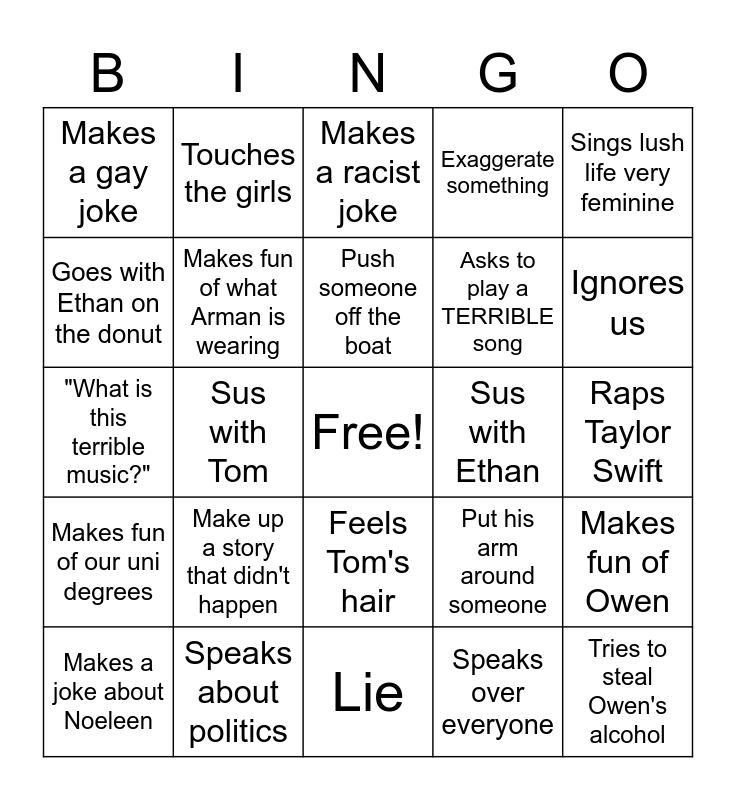This bingo card has a free space and 24 words: Make up a story that didn't happen, Speaks about politics, Push someone off the boat, Makes a joke about Noeleen, Sings lush life very feminine, Makes a gay joke, Goes with Ethan on the donut, Touches the girls, Sus with Ethan, Feels Tom's hair, Asks to play a TERRIBLE song, "What is this terrible music?", Put his arm around someone, Makes fun of Owen, Makes fun of what Arman is wearing, Speaks over everyone, Raps Taylor Swift, Makes a racist joke, Ignores us, Sus with Tom, Tries to steal Owen's alcohol, Makes fun of our uni degrees, Exaggerate something and Lie.