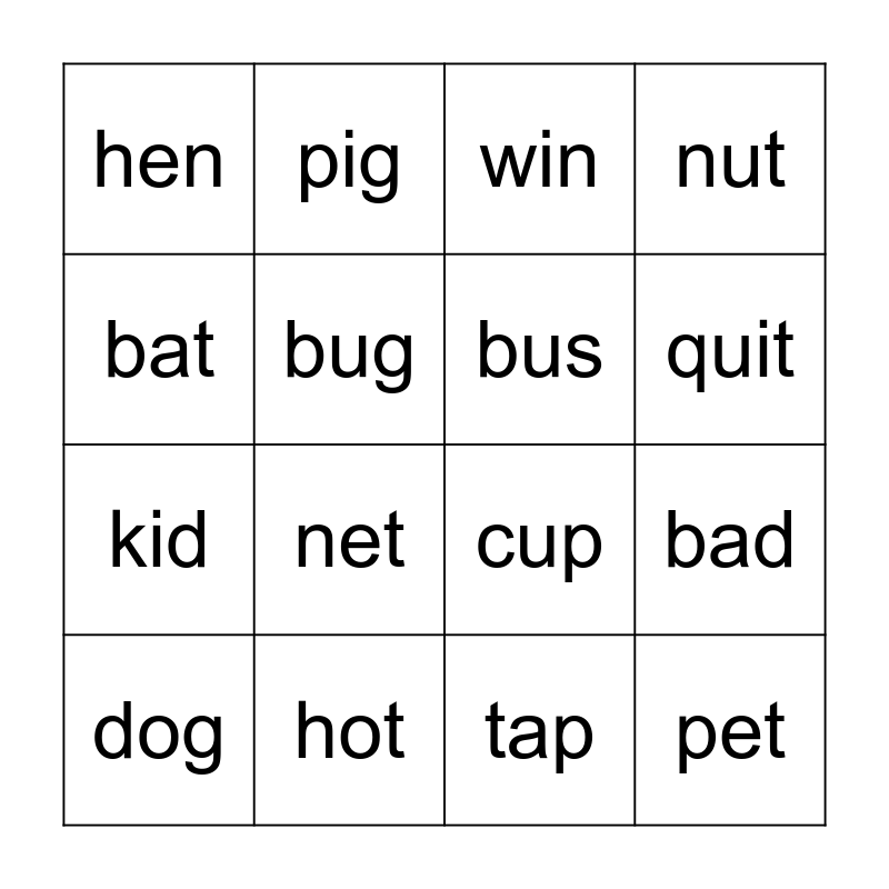This bingo card has 16 words: hot, bad, win, hen, kid, pig, cup, tap, bat, bug, dog, nut, net, quit, bus and pet.