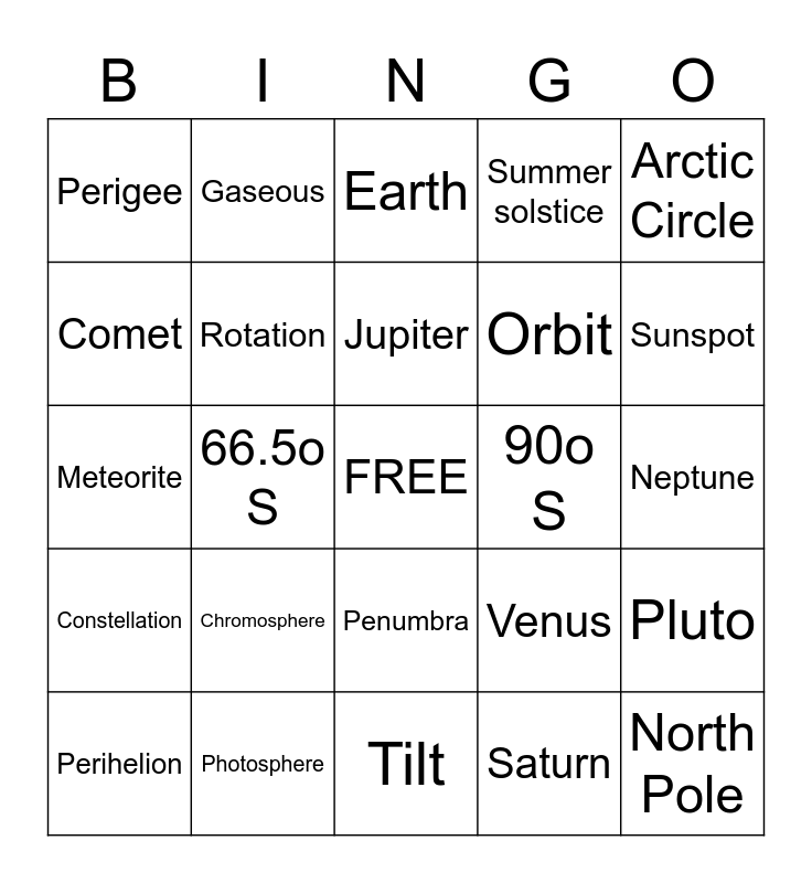 This bingo card has a free space and 55 words: Aphelion, Perihelion, Apogee, Perigee, Tilt, Insolation, Rotation, Revolution, Orbit, Ellipse, Summer solstice, Winter solstice, Spring equinox, Fall equinox, Tropic of Capricorn, 23.5o N, Arctic Circle, 66.5o S, Equator, North Pole, 90o S, Mercury, Venus, Earth, Mars, Jupiter, Saturn, Uranus, Neptune, Pluto, Asteroid Belt, Meteor, Meteoroid, Asteroid, Comet, Meteorite, Milky Way Galaxy, Constellation, Galaxy, Terrestrial, Gaseous, Moon, Sun, Corona, Chromosphere, Photosphere, Radiative Zone, Convective Zone, Core, Sunspot, Lunar Eclipse, Solar Eclipse, Umbra, Penumbra and Big Bang.