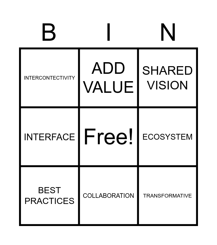 This bingo card has a free space and 8 words: ECOSYSTEM, SHARED VISION, ADD VALUE, BEST PRACTICES, INTERCONTECTIVITY, TRANSFORMATIVE, INTERFACE and COLLABORATION.