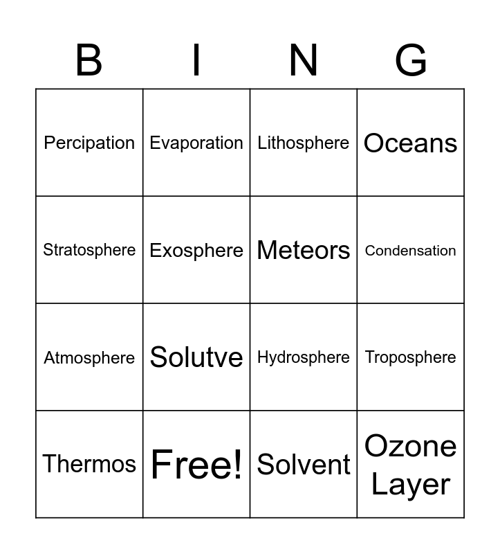 This bingo card has 16 words: Free!, Troposphere, Lithosphere, Percipation, Atmosphere, Evaporation, Hydrosphere, Solvent, Stratosphere, Exosphere, Thermos, Oceans, Solutve, Condensation, Meteors and Ozone Layer.