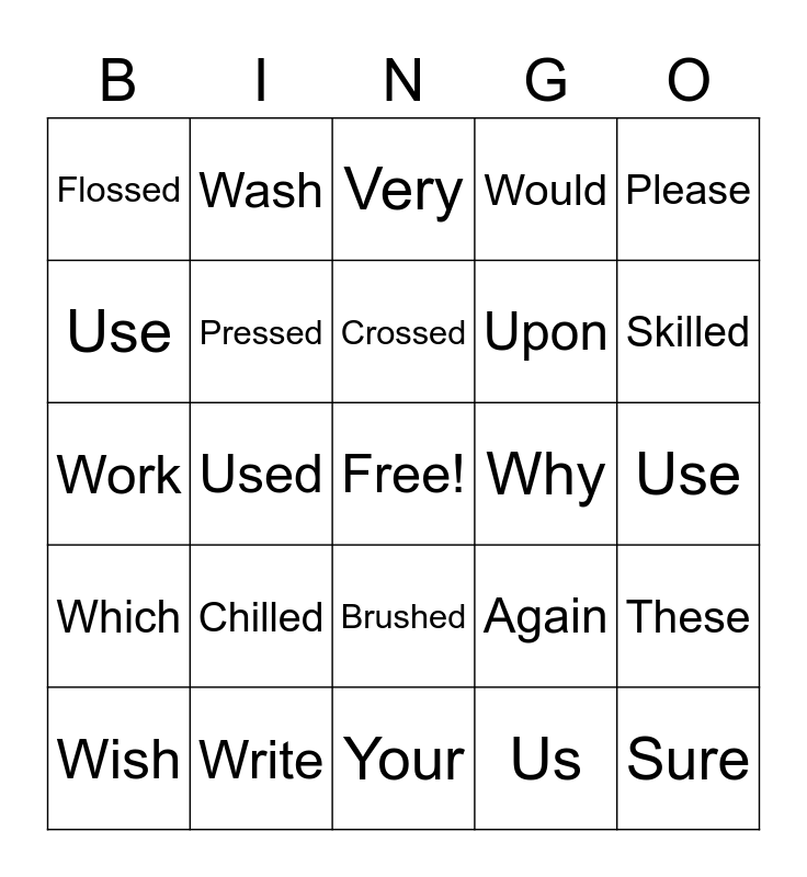 This bingo card has a free space and 28 words: These, Those, Upon, Us, Use, Very, Wash, Which, Why, Wish, Work, Would, Write, Your, Skilled, Stalled, Chilled, Pressed, Crossed, Brushed, Flossed, Winked, Sure, Used, Use, Again, Please and Animal.
