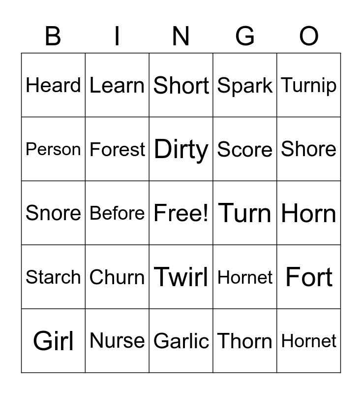 This bingo card has a free space and 24 words: Churn, Nurse, Dirty, Girl, Turnip, Heard, Person, Learn, Turn, Twirl, Score, Snore, Hornet, Fort, Forest, Thorn, Horn, Short, Shore, Before, Hornet, Starch, Spark and Garlic.