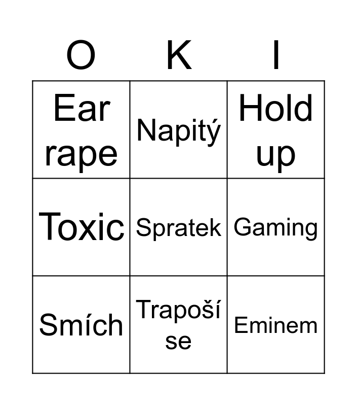 This bingo card has a free space and 8 words: Gaming, Hold up, Napitý, Smích, Ear rape, Eminem, Toxic and Trapoší se.