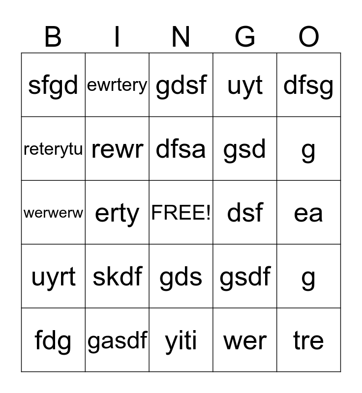 This bingo card has a free space and 24 words: skdf, gasdf, dfsa, fdg, dfsg, sfgd, reterytu, ewrtery, dsf, gds, gsd, werwerw, gsdf, g, rewr, wer, ea, gdsf, g, erty, tre, uyrt, uyt and yiti.