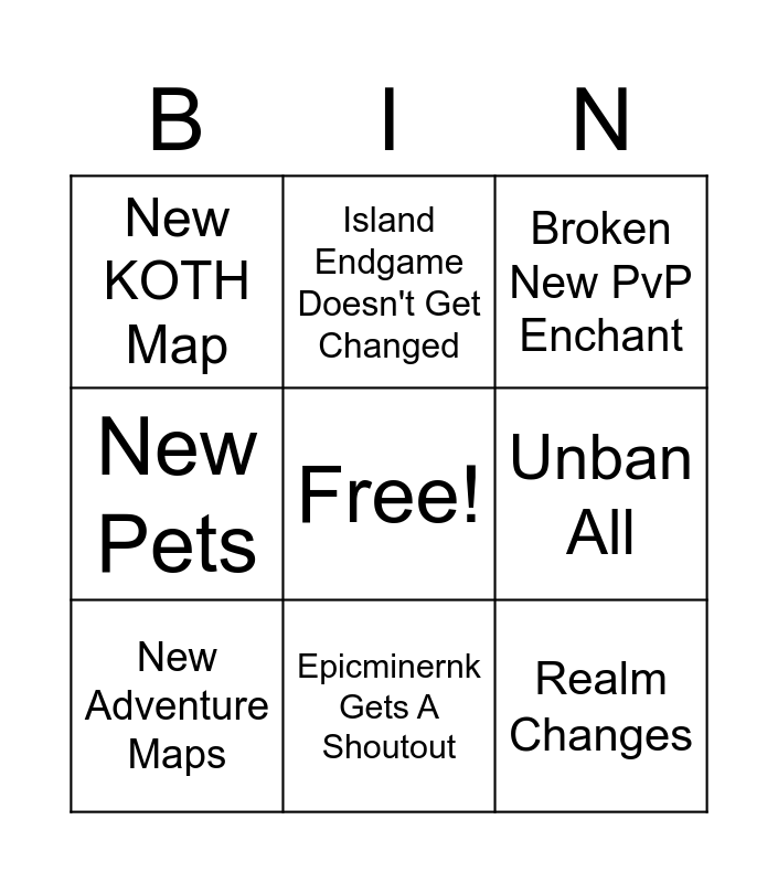 This bingo card has a free space and 8 words: Unban All, Broken New PvP Enchant, Island Endgame Doesn't Get Changed, New Adventure Maps, New KOTH Map, Realm Changes, New Pets and Epicminernk Gets A Shoutout.