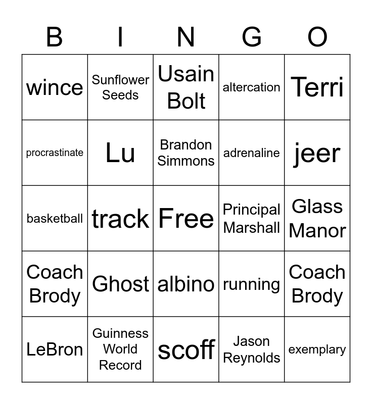 This bingo card has a free space and 32 words: Jason Reynolds, Castle Cranshaw, track, The Defenders, Coach Brody, Lu, Terri, Coach Brody, Sunflower Seeds, Mr. Charles, Brandon Simmons, Usain Bolt, Patty, Sunny, Principal Marshall, ladders, LeBron, basketball, albino, Ghost, running, Ma, Glass Manor, Guinness World Record, exemplary, altercation, adrenaline, procrastinate, wince, scoff, smirk and jeer.