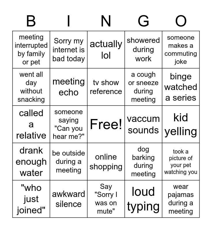 This bingo card has a free space and 31 words: Say "Sorry I was on mute", send a text to a coworker during a meeting, someone saying "Can you hear me?", Doorbell interruption, meeting interrupted by family or pet, actually lol, meeting echo, dog barking during meeting, vaccum sounds, loud typing, kid yelling, wear pajamas during a meeting, did chair yoga, stretch break, binge watched a series, made an awesome lunch, took a picture of your pet watching you, be outside during a meeting, drank enough water, online shopping, someone makes a commuting joke, did laundry, "who just joined", Sorry my internet is bad today, a cough or sneeze during meeting, went all day without snacking, showered during work, called a relative, awkward silence, tv show reference and sports reference.
