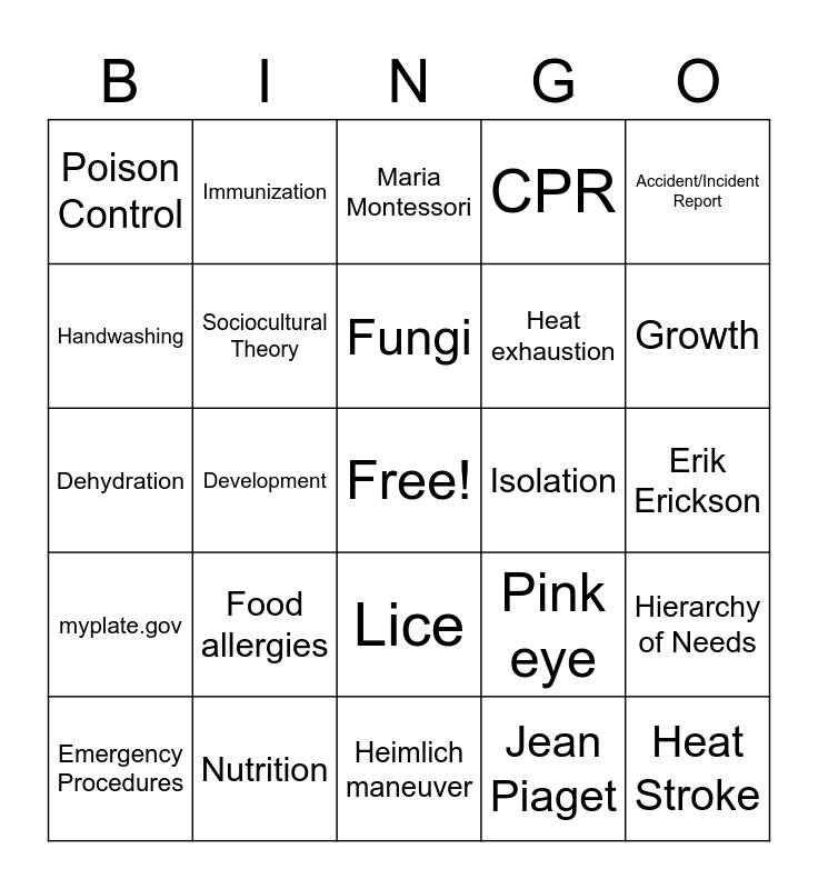 This bingo card has a free space and 24 words: Food allergies, Nutrition, Fungi, Emergency Procedures, Accident/Incident Report, Poison Control, Handwashing, Immunization, Isolation, Lice, Heat exhaustion, Dehydration, Pink eye, Hierarchy of Needs, Sociocultural Theory, Jean Piaget, Erik Erickson, Maria Montessori, Growth, Development, Heat Stroke, myplate.gov, CPR and Heimlich maneuver.