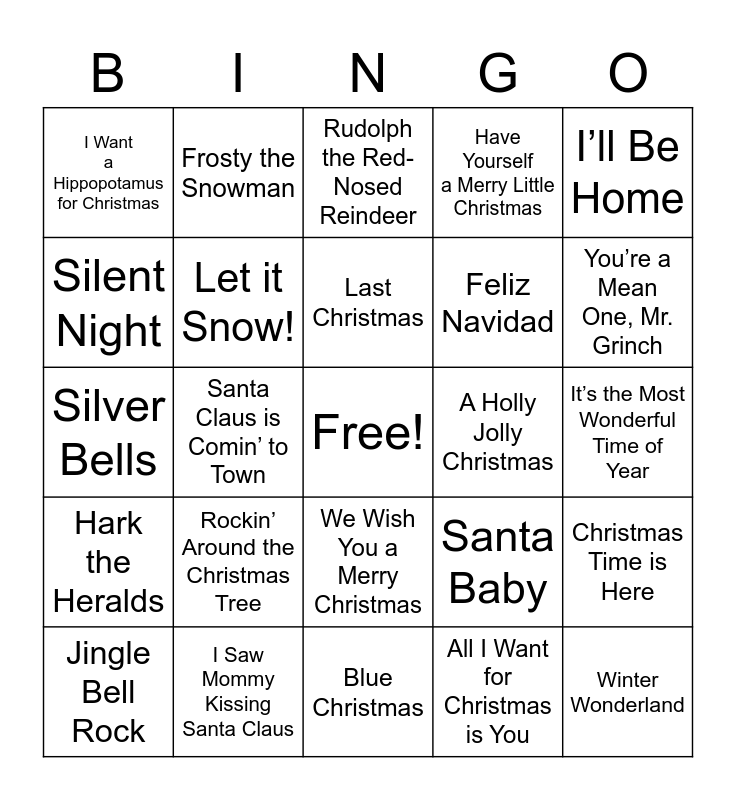 This bingo card has a free space and 24 words: Jingle Bell Rock, Rockin’ Around the Christmas Tree, Last Christmas, All I Want for Christmas is You, I’ll Be Home, I Want a Hippopotamus for Christmas, Frosty the Snowman, Rudolph the Red-Nosed Reindeer, A Holly Jolly Christmas, It’s the Most Wonderful Time of Year, Silver Bells, Let it Snow!, Santa Baby, Christmas Time is Here, Silent Night, I Saw Mommy Kissing Santa Claus, Blue Christmas, Have Yourself a Merry Little Christmas, You’re a Mean One, Mr. Grinch, Hark the Heralds, Santa Claus is Comin’ to Town, We Wish You a Merry Christmas, Feliz Navidad and Winter Wonderland.