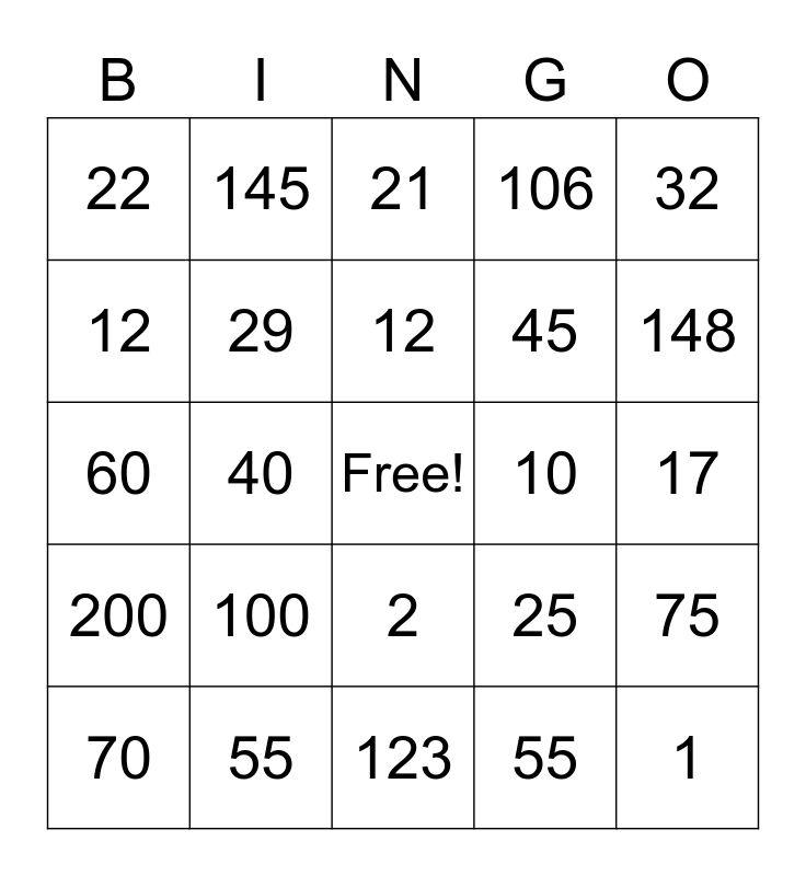 This bingo card has a free space and 24 words: 100, 55, 12, 70, 32, 22, 12, 145, 10, 2, 45, 60, 25, 75, 29, 55, 17, 21, 148, 40, 1, 200, 106 and 123.