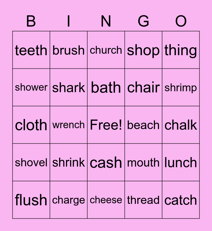 This bingo card has a free space and 24 words: shrink, charge, bath, flush, thing, teeth, shower, brush, beach, cash, chair, cloth, mouth, lunch, shark, thread, chalk, church, shrimp, wrench, catch, shovel, shop and cheese.