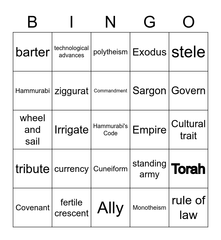 This bingo card has 30 words: fertile crescent, Mesopotamia, Irrigate, city-state, barter, polytheism, ziggurat, Cuneiform, Empire, Ally, Cultural trait, Hammurabi's Code, Monotheism, rule of law, Govern, calvary, standing army, tribute, currency, stele, wheel and sail, Sumerian advances in math, technological advances, Sargon, Hammurabi, Exodus, Torah, Covenant, Commandment and Ethics.