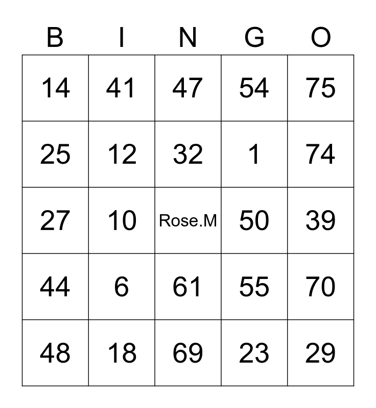 This bingo card has a free space and 24 words: 6, 18, 32, 48, 75, 14, 25, 41, 50, 61, 1, 27, 55, 70, 12, 23, 39, 47, 74, 10, 29, 44, 54 and 69.
