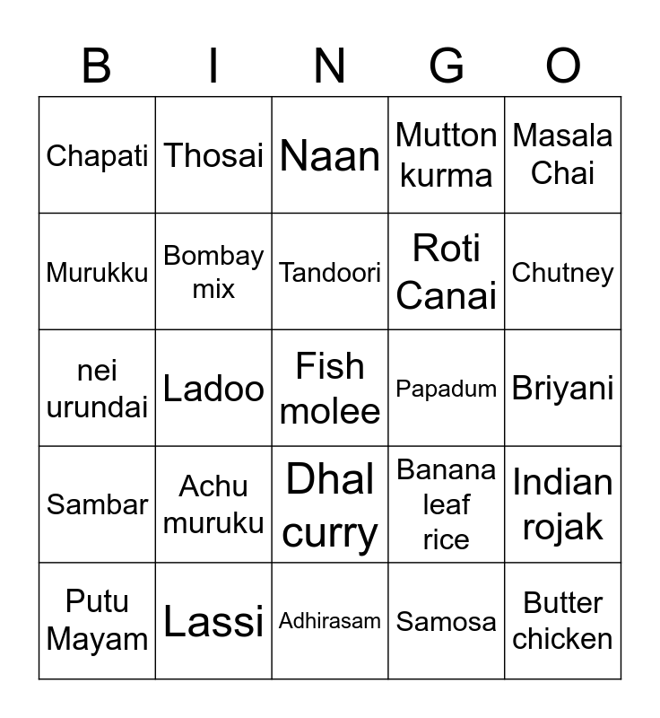 This bingo card has 25 words: Achu muruku, Adhirasam, Tandoori, Putu Mayam, Masala Chai, Chapati, Murukku, Thosai, Papadum, Dhal curry, Roti Canai, nei urundai, Banana leaf rice, Indian rojak, Bombay mix, Butter chicken, Briyani, Naan, Chutney, Ladoo, Fish molee, Lassi, Sambar, Mutton kurma and Samosa.