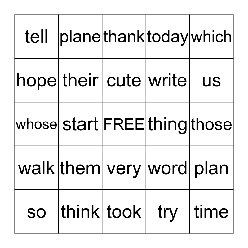 This bingo card has a free space and 29 words: so, something, start, surprise, tell, thank, their, them, thing, think, those, time, took, try, us, use, very, walk, which, whose, word, work, write, hope, today, plane, plan, cute and cut.