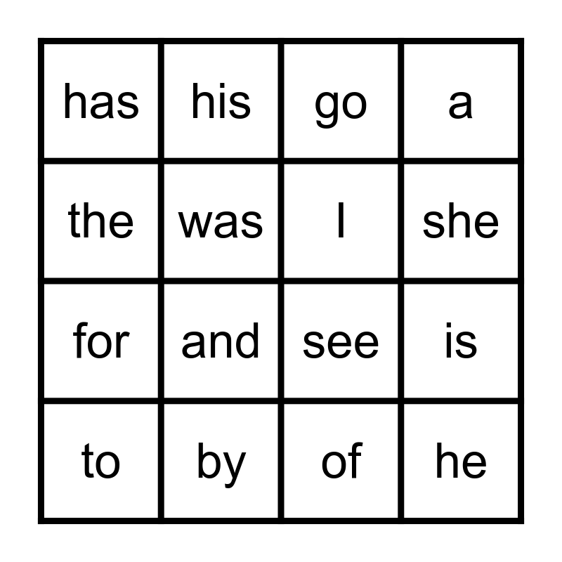 This bingo card has 16 words: by, is, go, has, for, his, see, of, the, was, to, a, and, she, I and he.