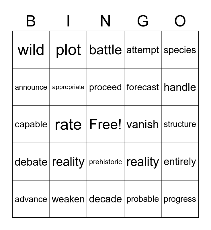 This bingo card has a free space and 24 words: reality, weaken, proceed, advance, species, wild, announce, plot, vanish, prehistoric, forecast, capable, reality, entirely, appropriate, probable, structure, battle, handle, rate, progress, debate, attempt and decade.