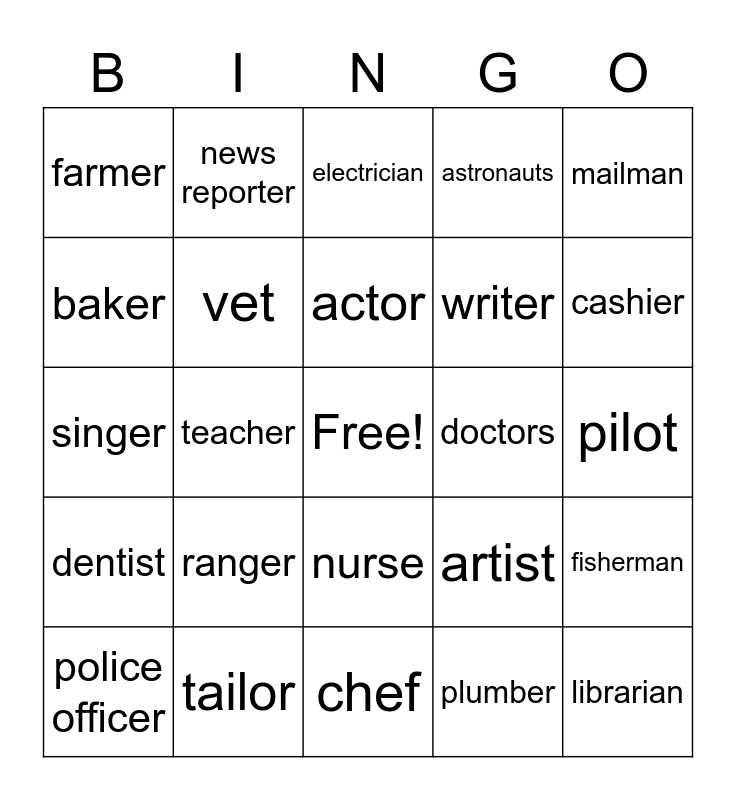 This bingo card has a free space and 29 words: police officer, firefighter, teacher, coach, farmer, electrician, vet, ranger, doctors, tailor, pilot, librarian, chef, plumber, cashier, principal, nurse, dentist, mailman, singer, artist, photographer, writer, baker, astronauts, news reporter, fisherman, actor and dancer.