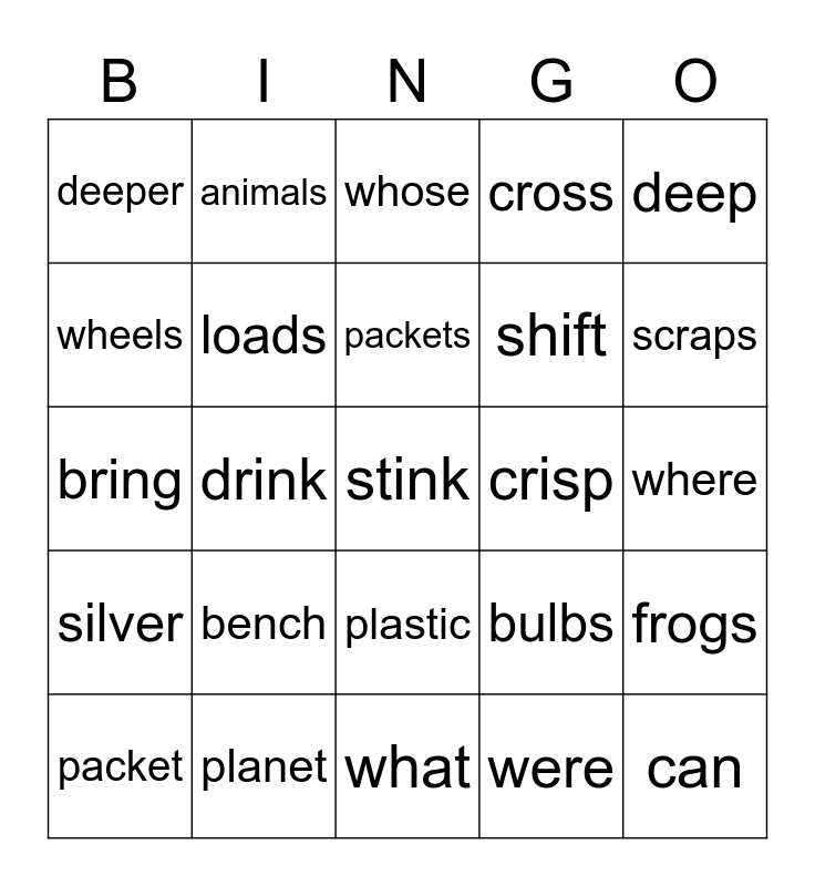 This bingo card has a free space and 24 words: bench, planet, packets, packet, deep, deeper, wheels, animals, crisp, plastic, shift, bring, bulbs, frogs, loads, were, where, whose, scraps, drink, can, silver, cross and what.