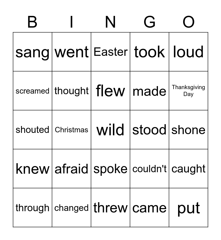 This bingo card has a free space and 24 words: afraid, changed, flew, through, loud, sang, screamed, went, stood, spoke, made, shouted, couldn't, caught, thought, came, shone, Easter, Thanksgiving Day, Christmas, put, knew, took and threw.